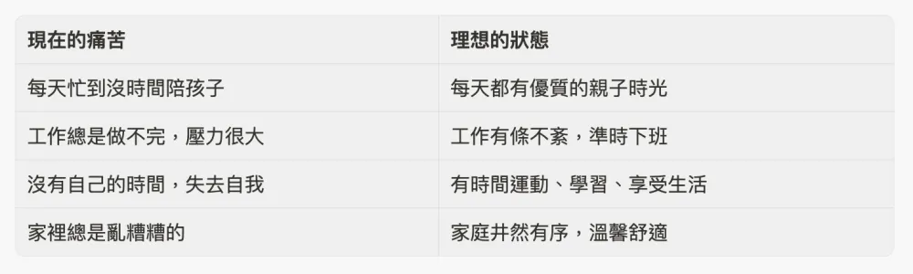 •✅ 客戶導向:「你是不是每天忙到沒時間陪孩子,卻又擔心工作表現?」